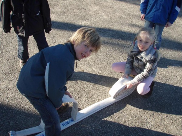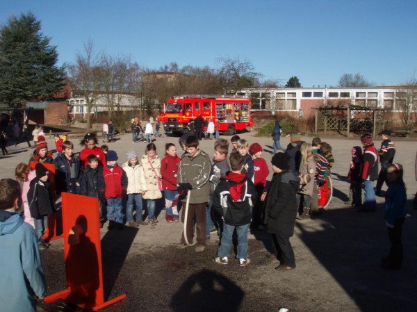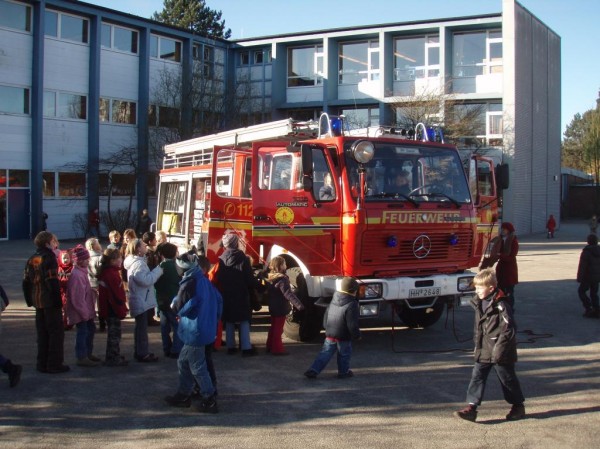 Am Freitag stand nun bei den jüngsten das Thema Feuer auf dem Stundenplan. Was lag da näher als die Feuerwehr mit einzubeziehen. Pünktlich um 9.°° Uhr rollten 2 Löschfahrzeuge der Freiwilligen Feuerwehr Sasel auf den Schulhof. Gemeinsam mit den Kindern wurden dann den Vormittag über Schläuche ausgerollt, erklärt und am Ende eine gemeinsame Übung mit einem richtigen kleinen Feuer absolviert. Parallel wurden Bilder gemalt und das Erlebte festgehalten. Die Jüngsten waren mit Feuereifer dabei und träumen in großer Zahl davon, einmal Feuerwehrmann/frau zu werden. Umgesetzt haben das bereits 14 Kinder im Alter von 6 – 9 Jahren, die in Sasel bereits in der Minifeuerwehr sind und sich regelmäßig in den Räumen der FF Sasel treffen. Ab 10 kann dann die Feuerwehrkarriere in der Jugendfeuerwehr starten, die zur Zeit noch einige wenige Plätze in der Jugendfeuerwehr frei hat.