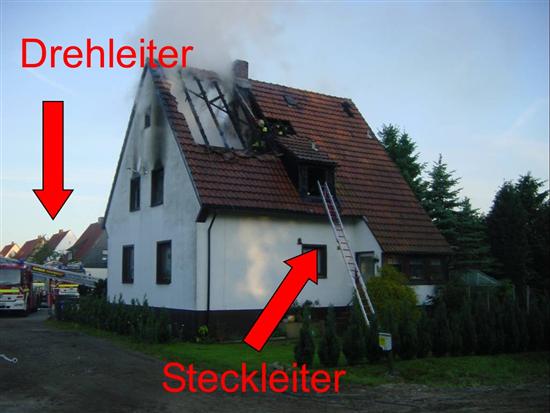 Fluchtartig zogen sich die Trupps zurück. Der Trupp im Parterre erreichte ohne Probleme die Haustür. Der Trupp im 1. OG sprang förmlich aus dem Fenster auf die Steckleiter (darüber ging der Trupp auch vor) und stieg schnell ab.