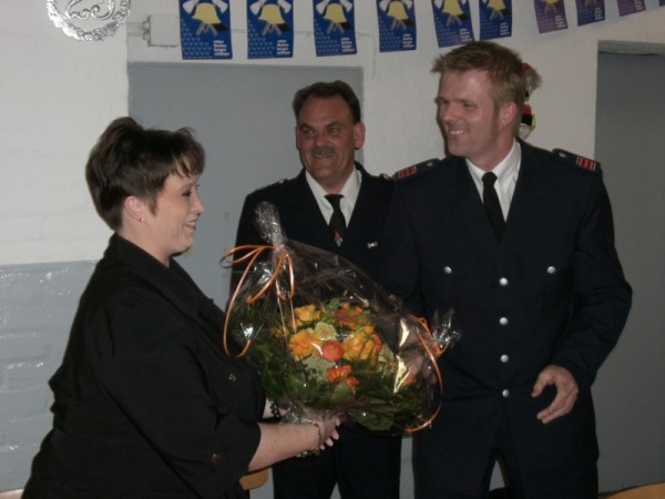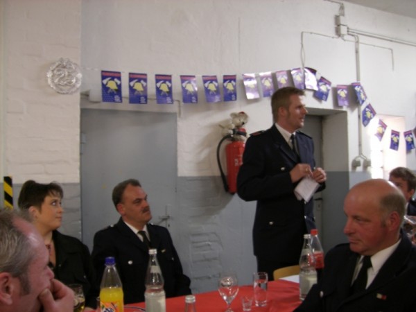 Nach einem hervorragenden Essen, beglückwünschte Karsten Dabelstein Andreas im Namen von Udo Nagel, Klaus Maurer und Hermann Jonas. Dabei verlieh er Andreas die Feuerwehrverdienstmedaille in Silber. Auch Wehrführer-Vertreter Bernd Rieck bedankte sich im Namen der Wehr für das langjährige Engagement bei dem Rettungsdienstspezialisten. Neben dem Rettungsdienst hat sich Andreas außerdem als Gruppenführer, Kraftfahrer und Bootsführer bewährt. Er besuchte zahlreiche Lehrgänge und machte als einer der ersten in der Wehr die Ausbildung zum Rettungsschwimmer. Als Dankeschön der Wehr gab es dafür einen großen Präsentkorb sowie eine Digitalkamera. Ehefrau Michaela erhielt als Dankeschön je einen Blumenstrauß von der Wehr und vom Bereichsführer. Last but not least gab es auch von Andreas´ Putzgruppe ein kleines Präsent.