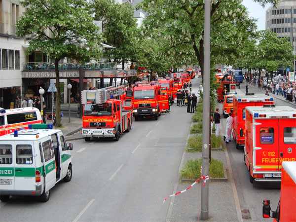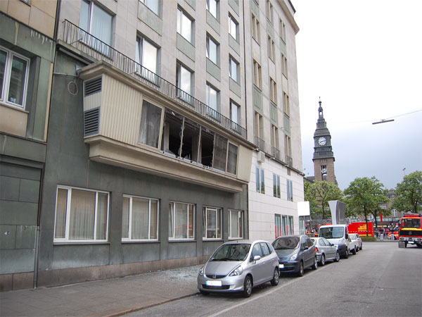 Zwischen 18:15 Uhr und 19:55 Uhr brannte es zwei Mal in der Adenauerallee, in der Kirchenallee sowie in der Straße Besenbinderhof. Menschen kamen durch die Brände nicht zu Schaden. Ein Hotel in der Kirchenallee musste vollständig evakuiert werden. Da die Treppenhäuser wegen der starken Rauchentwicklung teilweise nicht mehr betreten werden konnten, mussten Hotelgäste über Drehleitern der Feuerwehr ins Freie gebracht werden.
