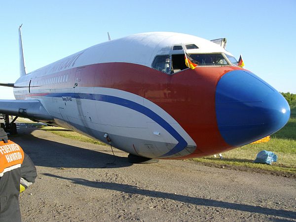 Das Übungsflugzeug des Hamburger Flughafens - das Szenario sah vor, dass das Bugfahrwerk abriss.
