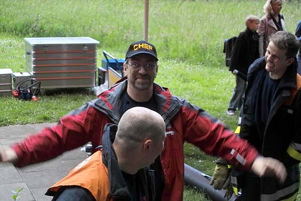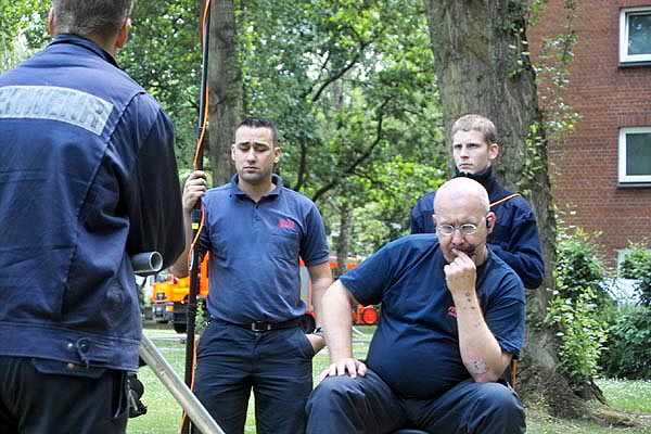 Wie bei der Feuerwehr üblich war auch an diesem Wochenende Improvisation gefragt. Ein Darsteller der JF Lurup fiel überraschend für die Dreharbeiten aus, ein neuer „Schauspieler“ musste gefunden werden um die Dreharbeiten nicht beenden zu müssen. Kurzerhand sprang Linus, ein Mitglied der JF Fuhlsbüttel ein und zog die Kuh vom Eis. Die Dialoge des Drehbuchs wurden kurzerhand vor Ort umformuliert und weiter gings.