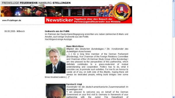 Das Auswärtige Amt beglückwünschte die Begegnung, der Koordinator für die deutsch-amerikanische Zusammenarbeit, Karsten D. Voigt, schrieb:“I am pleased to welcome you on behalf of the German Government on your first visit to Germany in framework of your partnership with the Junior Fire Department of Hamburg-Stellingen. […] And as such I very much appreciate your coming to Germany, not only as partners, but also as friends.