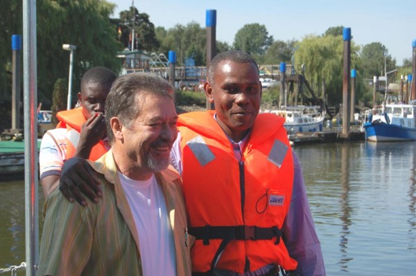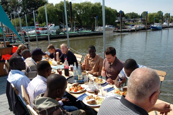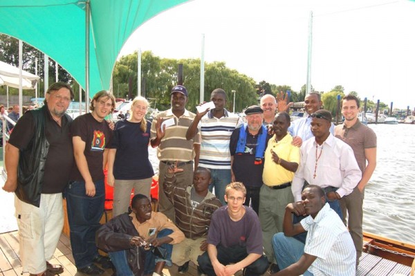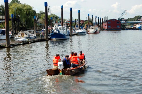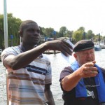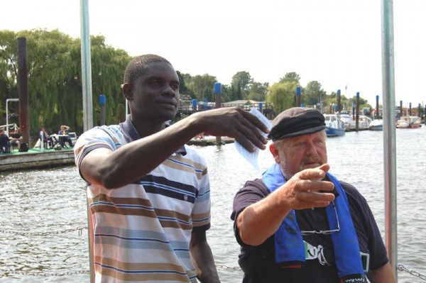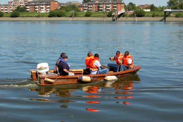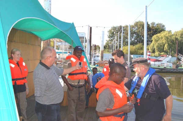 Der anschließende sonnige Sonntag stand ganz im Zeichen des Wassersports. Der gemeinnützige Verein MTZ-Hamburg lud die Afrikaner samt Begleiter zu einem „Tag auf und am Wasser“. Mit dem vereinseigenen Solarboot chauffierte Käptn Rüdiger die Gäste auf der Billwerder Bucht und in der Bille herum. Währenddessen wurde an Land durch Kameraden der FF Hamburg ein wenig „sonntägliche Ausbildung“ abgehalten. Matthias referierte über das Thema Stiche und Bunde und Fiete vom MTZ nahm sich der globalen Auswirkung durch Klimaveränderung an. Beide Themen wurden mit großem Interesse verfolgt und teilweise kritisch hinterfragt. Zuletzt gab der Kollege Lutz (ehemals BF Hamburg) einige Döntjes aus seiner Zeit bei der Feuerwehr zum Besten. Ein gemeinsames Mittagessen auf einem Ponton mitten in der Billwerder Bucht rundete den Besuch ab.