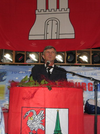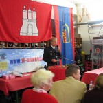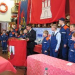 Als nächster ergriff Hermann Jonas das Wort. Er stellte vor allem den Spaß in den Vordergrund, den ein Mitwirken in der Jugendfeuerwehr sowohl natürlich den Jugendlichen selbst als aber auch den Jugendfeuerwehrwarten und ihren Helfern bereiten kann. Lebhaft auszuschmücken wusste er dies mit der einen oder anderen Anekdote aus seinen eigenen feuerwehrtechnischen Anfängen. Abschließend übergab er zunächst die Gründungsurkunde der JF Bergstedt, ehe sich deren Mitglieder über zwei Bälle, einen Fuß- und einen Basketball, als Geschenke freuen durften.