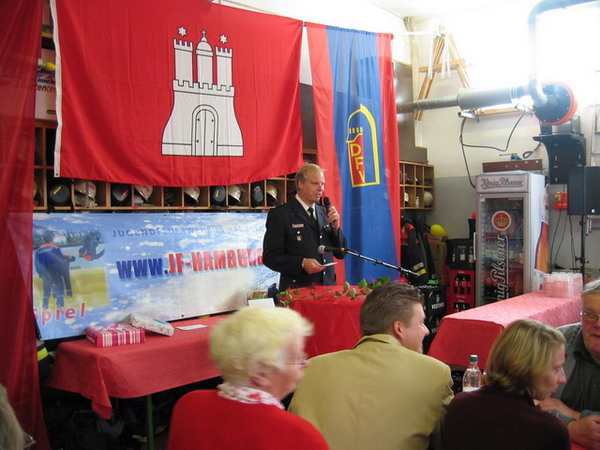 Eröffnet wurde die Feier mit einer kurzen Ansprache von Fabian Keller, Wehrführer der Bergstedter Feuerwehr. Er zeigte hierbei den in der Remise versammelten Gästen kurz den Ablauf bis zur Gründung der JF auf, bevor das Wort an Dr. Schulz übergeben werden sollte. Dieser hob in seiner Rede die Bedeutung der Freiwilligen Feuerwehren Hamburgs in ihren jeweiligen Stadtteilen hervor. Insbesondere ging er dabei auch auf den Stellenwert der Jugendarbeit ein, wie sie mittlerweile bei 60% der Wehren stattfinde.