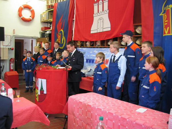 Hiernach wurde das Mikrophon nun Jens Zeyn-Kranz, dem Bergstedter Jugendfeuerwehrwart, übergeben. Gemeinsam mit seiner Vertreterin Yana Lübkemann machte er einige Ausführungen über das bisher Erlebte und Erlernte; schließlich finden die allwöchentlichen Zusammenkünfte mittlerweile seit Juni jeden Montagabend statt. Ferner wurden die 13 Mitglieder, bestehend aus drei Mädchen und zehn Jungen, vorgestellt.