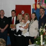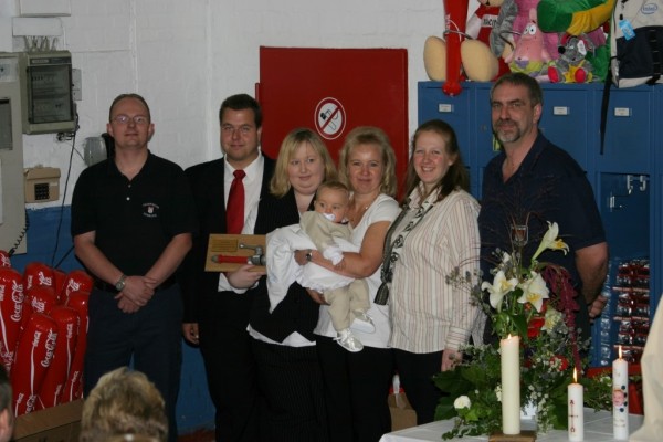 Zwei Kameraden der FF Lurup beförderten das Taufwasser aus einer Kübelspritze mit dem D-Rohr in die Hände der Pastorin, die damit den kleinen Tim taufte. Während der gesamten Zeremonie war ein Lächeln im Gesicht von Tim zu sehen. Zur Erinnerung überreichten im Anschluss an den Gottesdienst Wehrführer Jörg Braatz und Wehrführervertreter Marc Lorenzen, stellvertretend für die Kameraden der FF Lurup, ein Strahlrohr an die glücklichen Eltern.