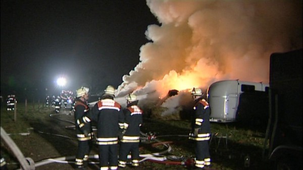 Kurz vor Mitternacht ging die Meldung über eine brennende Scheune an die FuRW 14 – Osdorf und die FF Osdorf. Wie sich herausstellte, brannten jedoch einstöckig gelagerte verpackte Stroh-Rundballen auf einer Fläche von 20x30m neben einem Reiterhof, umlagert von einer Anzahl Pferdetransportanhänger.