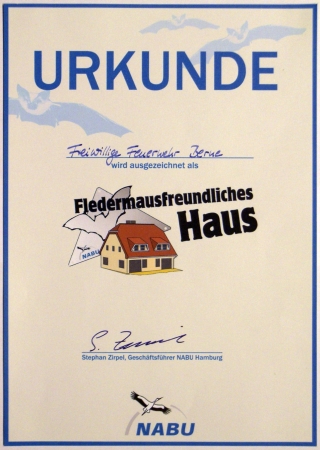 Mitte Februar hat der NABU (Naturschutzbund) Hamburg der Freiwilligen Feuerwehr in Berne die Plakette „Fledermausfreundliches Haus“ verliehen. Dies ist die 51. Auszeichnung in Hamburg. Schon seit einigen Jahren war den Feuerwehrleuten aufgefallen, dass Fledermäuse in der Abenddämmerung den alten Schlauchturm umkreisten. Der mehr als 12 Meter hohe Turm, in dem früher die Feuerwehrschläuche zum Trocknen aufgehängt wurden, ist seit über 30 Jahren ungenutzt, doch Fledermäuse schienen ihn als Quartier entdeckt zu haben.