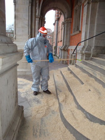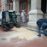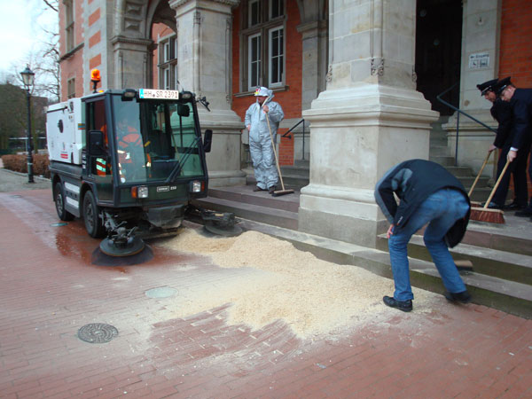 Da aber die kompletten Treppenstufen noch voller Sägespäne waren und in der Nähe ein Reinigungsfahrzeug der Stadtreinigung Hamburg unterwegs war, hat Sascha sich kurzerhand entschlossen den Fahrer zu bitten, sich seiner „Notsituation“ anzunehmen und ihn gefragt, ob er die Sägespäne aufnehmen könn.te