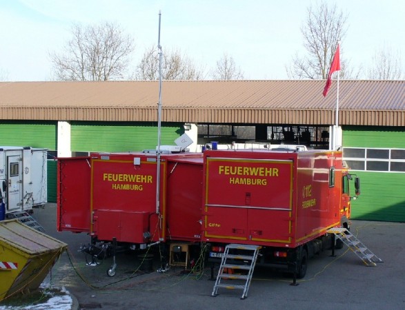 Am einem Dienstag im Februar kurz nach Mitternacht hatten sich Jean Gressmann, Tobias Westfahl und Thomas Menschel von der FF Wandsbek-Marienthal auf den langen Weg durch Dauerregen und Schneetreiben in Richtung Neuhausen aufgemacht. Nachdem am Dienstag Nachmittag unser Equipment, bestehend aus den neuen Gerätewagen-Fernmeldeausstattung (GW-FM) und Anhänger Führung, aufgebaut und fernmeldetechnisch verkabelt wurde, war der restliche Tag und die kommende Nacht zur wohlverdienten Erholung angesagt.