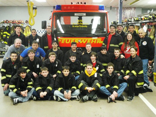 Die Mitglieder der Jugendfeuerwehr Mineola gemeinsam mit ihren Betreuern vor dem Geschenk aus Hamburg.