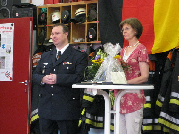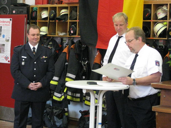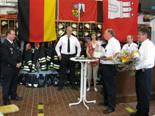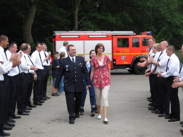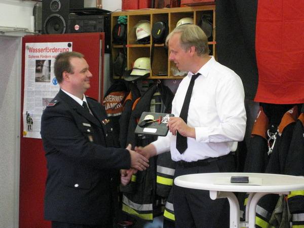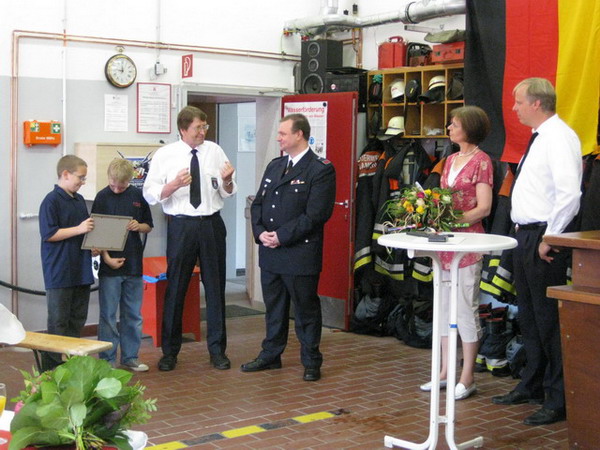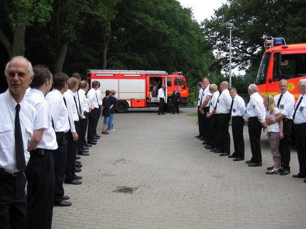 Aus diesem Anlass hat er am 04.07.2009 sein Jubiläum in der Feuerwache Bergstedt gefeiert und dazu alle Kameraden eingeladen. Mit anwesend war auch die Jugendfeuerwehr Bergstedt, in der auch seine beiden Töchter Svenja und Neele aktiv sind. Die Feier konnte erst mit einer Verzögerung beginnen, kam das Löschfahrzeug auf dem Weg zur Feuerwache mitsamt Jubilar und Wehrführer doch an einem Verkehrsunfall vorbei. Kurzerhand wurde die Unfallstelle abgesichert, die Polizei verständigt und die beteiligten Personen betreut, – zum Glück gab es keine Verletzten. Nach Eintreffen der Polizei konnte die Fahrt zur Jubiläumsfeier fortgesetzt werden.