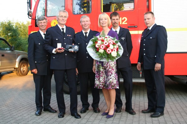 Landesbereichsführer Hermann Jonas würdigte Horsts unermüdlichen Einsatz für die Freiwillige Feuerwehr seit seinem Eintritt 1969 und verlieh ihm dafür die Feuerwehrverdienstmedaille der ersten Stufe.