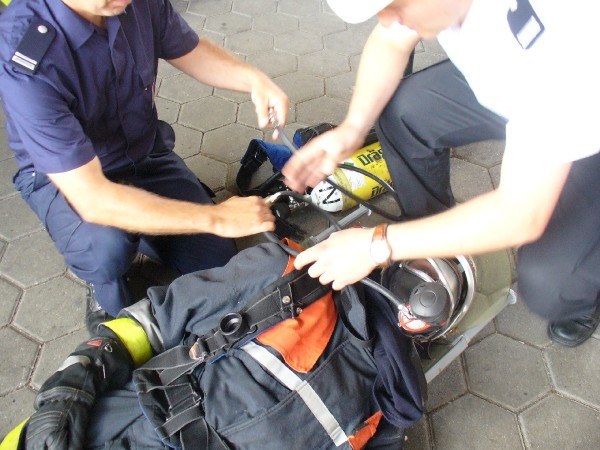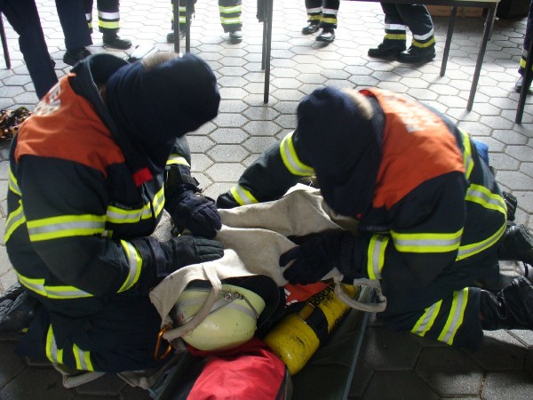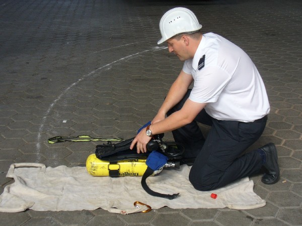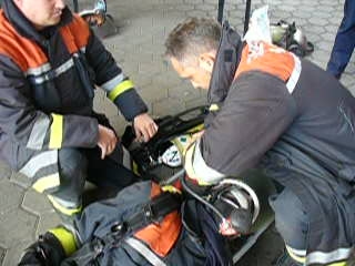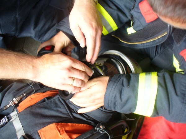 Im ersten praktischen Teil des Lehrganges wurde der Umgang mit dem Pressluftatmer PSS 90 geübt. Es wurden einfache Handgriffe mit dem Gerät erprobt, wobei der Schwierigkeitsgrad der Übung immer weiter gesteigert wurde. Am Ende der Übung wurde den Teilnehmern komplett die Sicht genommen.
