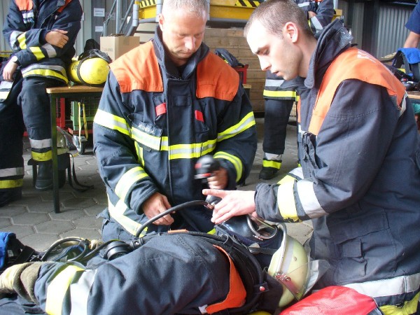 In Zusammenarbeit mit F03 (technische Abteilung) wurden die Lehrgangsteilnehmer darin unterrichtet, was im Zusammenhang mit dem Überdruck-Atemanschluss (Maske) Panorama Nova der Feuerwehr Hamburg zu beachten ist und welche Probleme durch Fehler in der Anwendung entstehen können.