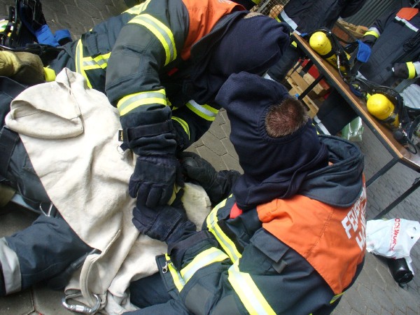 Im zweiten Praxisteil übte Lorenzen mit den Teilnehmern das Auffinden und Retten eines verunglückten Atemschutzgeräteträgers. Er unterwies die Teilnehmer im Herstellen des s.g. Sicherheitspacks, welches die Feuerwehr Köln nach dem tödlichen Dienstunfall eines Atemschutzgeräteträgers einführte. Dieses besteht aus einem Bergetuch, einem PA zur Sicherstellung der Atemluftversorgung, einer Bandschlinge, einer Maske und einer weiteren Bandschlinge sowie zwei Karabinerhaken. Dieses wird mit einer Feuerwehraxt so zu einem tragbaren Paket zusammengefügt, dass es in die Einsatzstelle mitgeführt werden kann.