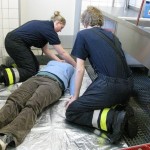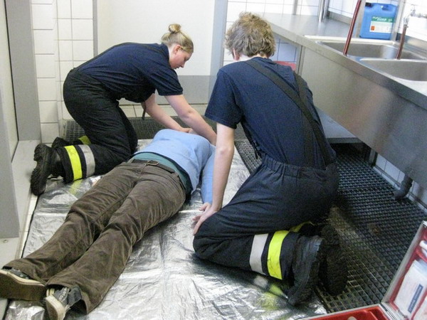 Im Rahmen der Ersten Hilfe war man mit einer beim Fensterputzen von der Leiter gestürzten Frau konfrontiert. Es galt, im Rahmen des Bodychecks den Verdacht auf eine Beckenfraktur zu diagnostizieren und die ersten Behandlungsschritte einzuleiten, bis die in der entsprechenden Rückmeldung angeforderten Kräfte (Rettungswagen und Notarzt) eintreffen würden.
