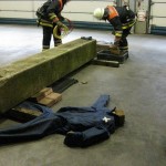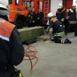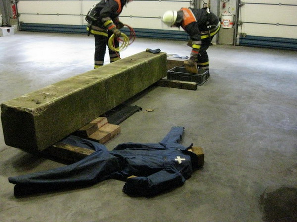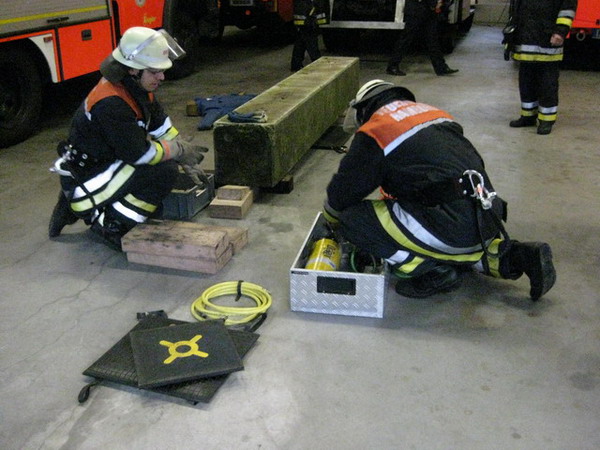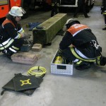 Im Bereich der Technischen Hilfe mussten die Prüflinge eine unter einem Betonelement eingeklemmte Person mittels Hebekissen retten, d.h. befreien. Besondere Aufmerksamkeit wurde hierbei der richtigen Arbeit mit den Pallhölzern und Keilen gewidmet, die ein Absacken der Last ausschließen sollte.