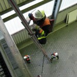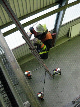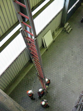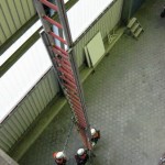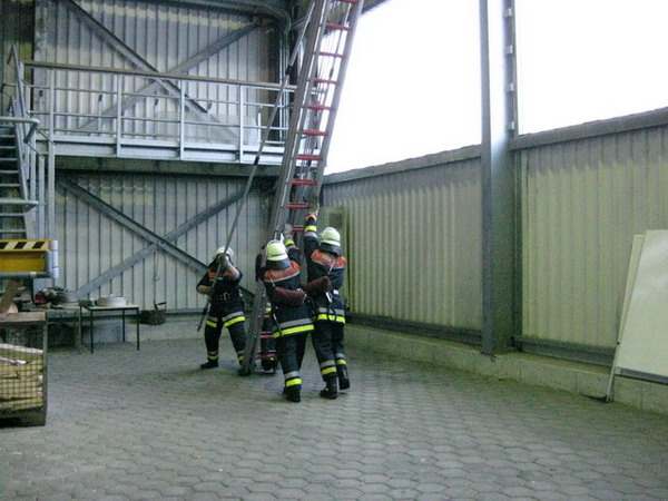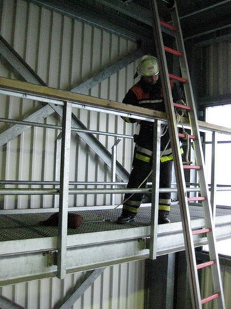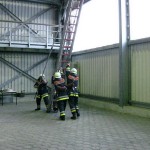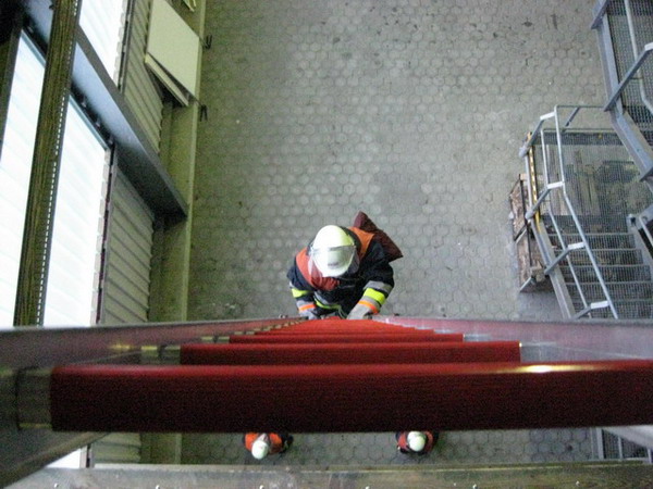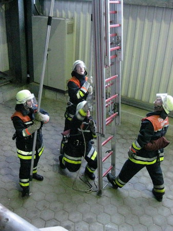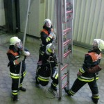 Die Aufgabe im Bereich Brandschutz war – wie jedes Jahr – das Instellungbringen der dreiteiligen Schiebleiter. Dies wurde jeweils von zwei Trupps gemacht. Nachdem der Angriffstruppführer die Schiebeleiter gesichert hatte, folgten ihm sein Truppmann sowie der zweite Trupp. Oben musste dann von jedem Prüfling noch einmal die Leiter gesichert werden.