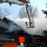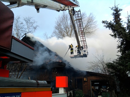 Die Brandbekämpfung erwies sich als äußerst schwierig, da das Feuer in Folge der zum Dachgeschoss führenden Holztreppe, die durchgebrannt war, nicht im Innenangriff bekämpft werden konnte. Somit konte das Feuer nur im Außenangriff über mehrere vorgenommene B- und C-Rohre bekämpft werden. Im weiteren Verlauf der über vier Stunden andauernden Löscharbeiten wurde die Brandbekämpfung insbesondere über das Teleskopmastfahrzeug 16 sowie über die Drehleiter 15 vorgenommen. Zuletzt wurde das Feuer unter Einsatz von Schaummittel (unter Zusatz von Schaummittel ist die Eindringtiefe von Wasser in Holz höher als beim Einsatz von normalem Wasser) bekämpft.