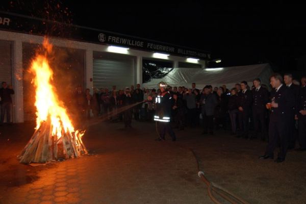 Diese führte ihn zum Hof des Feuerwehrhauses am Bergmannring, wo der angehende Feuerwehrrentner ein letztes Mal seine Löschkünste bei der Bekämpfung eines Lagerfeuers unter Beweis stellen musste.