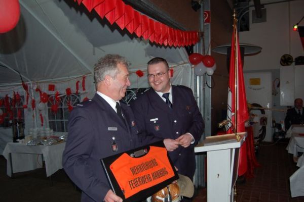 Wehrführer Matthias Proske unterstrich schließlich auch den großen Respekt vor der Leistung des Stellvertreters, seiner im Einsatz- und Ausbildungsdienst stets besonnenen Art und den geteilten Erfahrungen aus der Arbeit als Stellvertretender Wehrführer. Am Ende aller Reden stand die Aufnahme von Ingo Hagemann in die Ehrenabteilung der FF Billstedt-Horn, die deren Sprecher Lutz Elmers in gewohnt humoristischer Art durchführte. Elmers ernannte Hagemann zum Führer der Ehrenabteilung und überreichte eine Urkunde, die mit der besonderen Klausel ausgestattet war, nicht abgelehnt werden zu können.