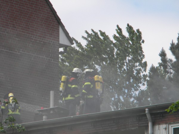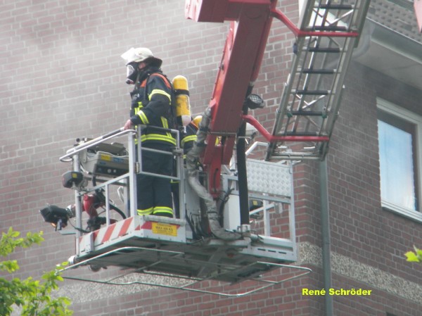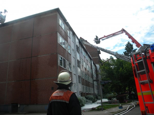 Bei Eintreffen der ersten Kräfte des Löschzuges der Feuerwache 25 und der wenig später mit beiden Löschfahrzeugen bereitstehenden Kameraden der Freiwilligen Feuerwehr Billstedt-Horn, hatten alle Bewohner des Hauses ihre Wohnungen verlassen. Zu diesem Zeitpunkt war die auf dem Dach verlegte Teerpappe an mehreren Stellen durchgebrannt und Flammen schlugen den Wehrleuten entgegen. Über die Drehleiter wurde ein erstes C-Rohr im Außenangriff vorgenommen. Der Angriffstrupp der freiwilligen Kameraden ging durch einen Treppenaufgang im Innenangriff gegen die Flammen vor. Dabei wurde eine Steckleiter durch eine Dachluke in Stellung gebracht, von der aus das sich schnell ausbreitende Feuer zwischen Dach und Decke des Gebäudes bekämpft wurde.