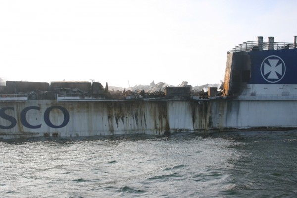 Das gewaltige Feuer hat zwei Löcher in die Außenwand des Schiffs gefressen. Ein etwa 8 m² großes Loch befindet sich an einem Außengang der Steuerbordseite.