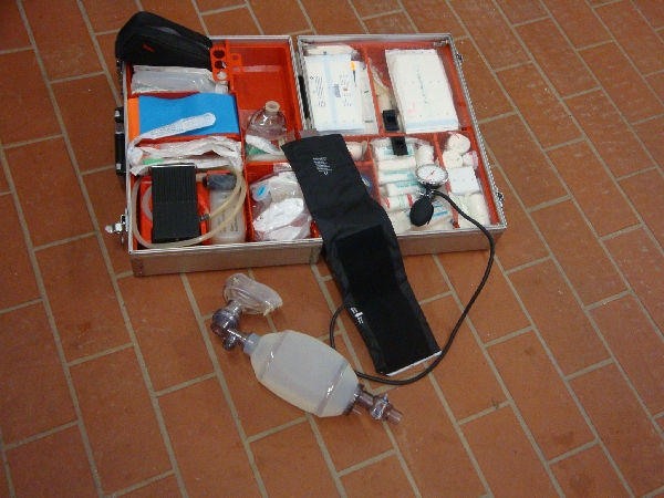 Ich biete meine Hilfe an. Während das EKG und der Beatmungs-beutel vorbereitet werden, schneide ich das T-Shirt auf und soll, nach Anschluß des Gerätes, die Herzdruckmassage