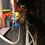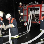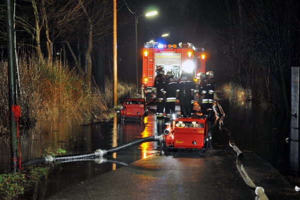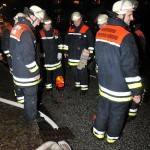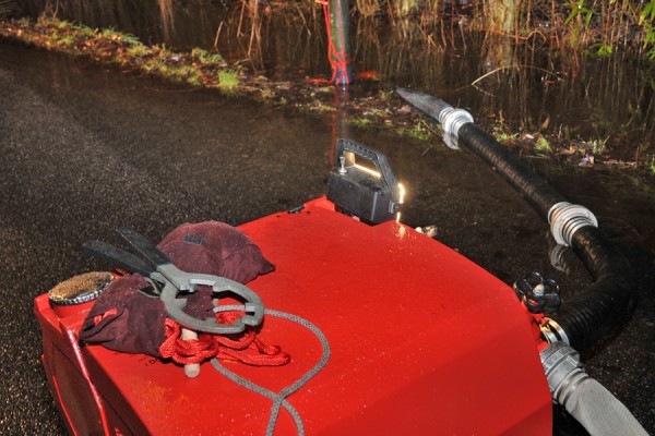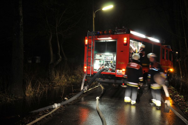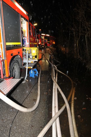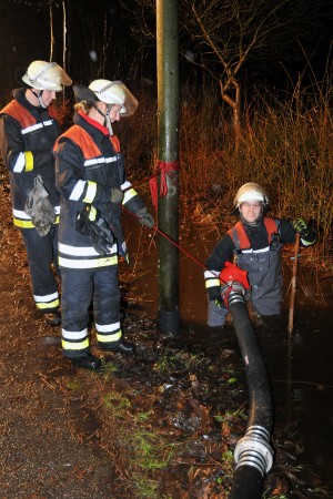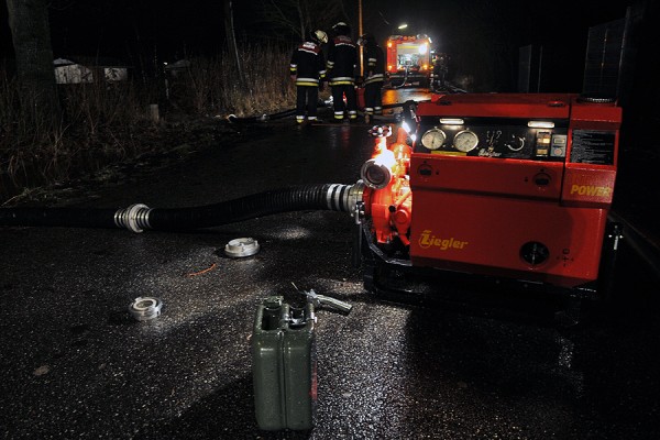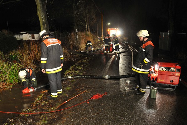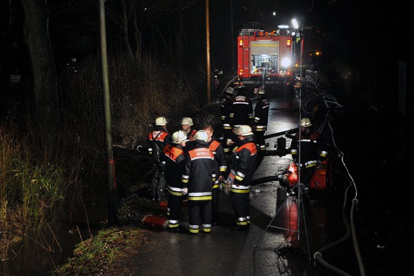 Man entschloss sich das Aufgebot nach rund 6 Stunden herunter zu fahren und rollte mehrere hundert Meter Schlauch mit den nachalarmierten Kräften der FF Kirchsteinbek auf. Mit Sandsäcken versuchte man dann das Wasser in eine andere Richtung zu leiten und pumpte vorerst mit einer Tragkraftspritze und 2 B-Abgängen weiter.