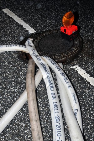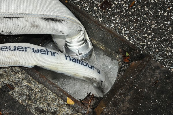 Die FF Öjendorf sowie die Vertretung für den Bereichsführer Bergedorf rückten an und verschafften sich ebenfalls einen Überblick. Die Fahrzeugpumpen und Tragkraftspritzen wurden in Stellung gebracht. Um das Wasser zum nächsten Ablauf zu befördern wurden bereits 40 B-Schläuche durch die Kräfte vor Ort verlegt. Da dies jedoch noch nicht reichte wurde der Schlauchwagen der FF Fünfhausen nachalarmiert. Schnell waren dann weitere 60 B-Schläuche verlegt. Nun wurde mit sechs Pumpen das Wasser in 8 B-Leitungen abgepumpt.