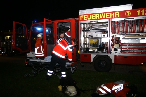 Da sich sein Wohlbefinden nicht verbesserte, wurde über die Leitstelle der Rettungsdienst angefordert. Dieser war zuvor an der Einsatzstelle, rückte jedoch ab nachdem bekannt wurde, dass sich keine Personen mehr im Gebäude befinden. Der Erkrankte bekam Mineralwasser gereicht und legte sich auf eine Sitzbank im LF. Kameraden betreuten ihn bis zum Eintreffen des Notarztes. Sein Zustand hatte sich bis dahin wieder etwas verbessert. Der Arzt übernahm die medizinische Betreuung und entschied sich, den Patienten zur weiteren Untersuchung in ein Krankenhaus einzuliefern. Dieses konnte er noch in der Nacht wieder verlassen.