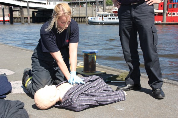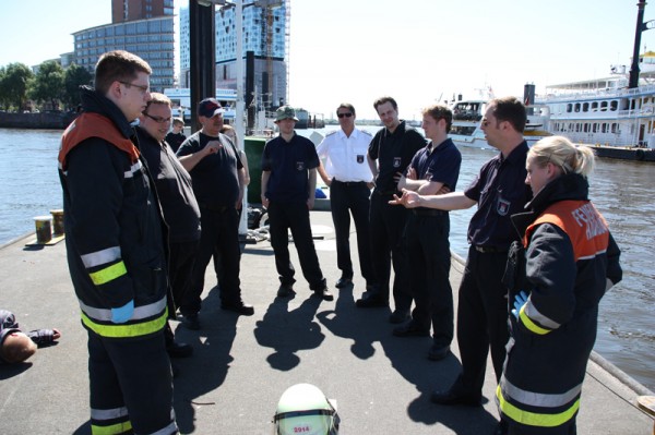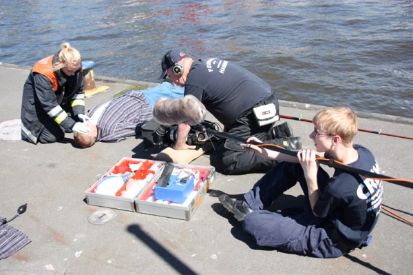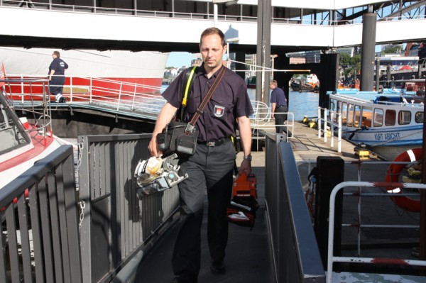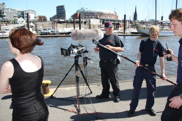 Der fachliche Teil im fertigen Produkt ist ein wichtiger Part, das „Drumherum“ jedoch nicht weniger spannend. In jede Lage wird der Zuschauer sozusagen „eingestimmt“ in die Situation die zu dem entsprechenden „Unglück“ führte. So ganz nebenbei transportiert der Film dann noch die „Message“ das er nicht irgendwo, sondern in Hamburg geschaffen wurde. So wurde am 4. Juni ein Angler an den Pontons der Überseebrücke reanimationspflichtig, das Ganze hübsch mit Michel und Feuerschiff im Hintergrund. Der Skaterunfall, der zur Unterschenkelfraktur führt wurde auf der Magellan-Terrasse in der Hafencity gedreht, mehr Hamburgbezug geht kaum :). Unser Treiben schien für den Einen oder Anderen recht interessant zu sein, so machte sich in den Vormittagsstunden Michael Giehl, Fachbereichsleiter Rettungssanitäter der Feuerwehrakademie, vor Ort ein Bild von unseren Aktivitäten. Am Set in der Hafencity wurden wir dann noch kurz vor Drehschluss von einem Besuch unseres Innensenators, Herrn Michael Neumann, überrascht. Auch er wollte sich über unsere, für eine Feuerwehr untypische Aktivität, informieren und dankte dem gesamten Team für ihr Engagement.