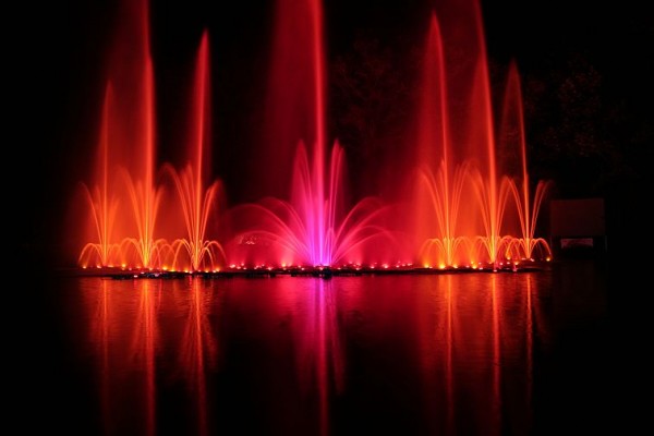Dreißig Meter hohe Fontänen aus 600 zum Teil beweglichen Düsen, angeleuchtet von 600 farbigen Unterwasserscheinwerfern mit einem Anschlusswert von 60.000 Watt: das sind die Superlative der "Leuchtenden Fontänen" der Freiwilligen Feuerwehr Soltau.