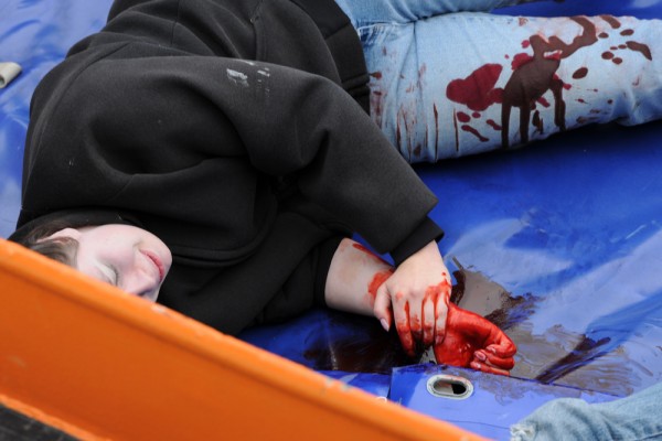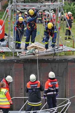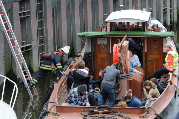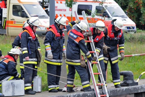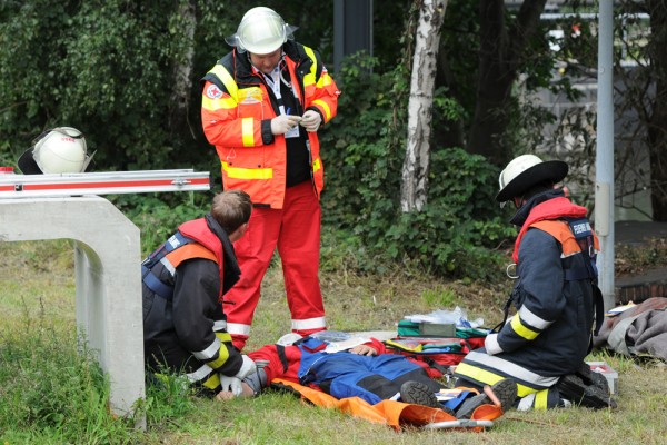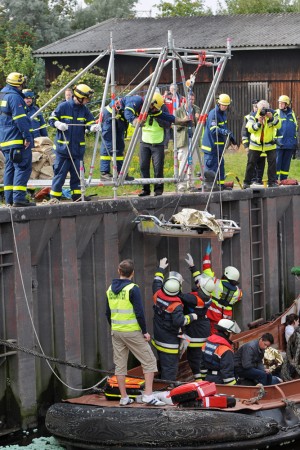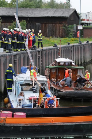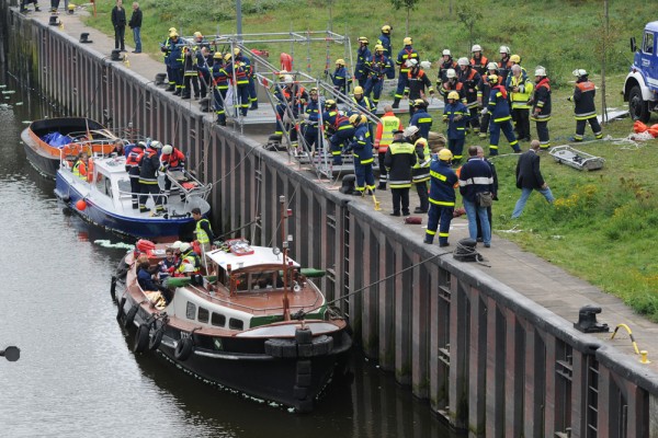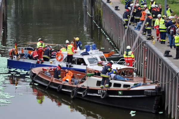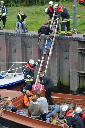 Das Szenario bestand aus zwei Barkassen, die in einer Schleuse zusammen gestoßen sind und dann ein drittes Schiff gerammt haben. Zahlreiche Statisten, verteilt auf den beiden Barkassen, schrien bei der Ankunft der ersten Rettungskräfte um Hilfe. Die ersteintreffende Freiwillige Feuerwehr Cranz verschaffte sich zunächst von einem benachbarten Betriebsgelände einen Zugang zur Schleuse. Dem Gruppenführer bot sich ein Bild des Grauens. Nach einer ersten Lageerkundung wurde eine vierteilige Steckleiter in Stellung gebracht und ein erster Feuerwehrtrupp konnte eine der beiden  Barkassen betreten. Noch bevor eine Fangleine zur Sicherung der Barkasse befestigt werden konnte, versuchten die noch ansprechbaren Verletzten Hilfe zu bekommen. Nachdem die erste Barkasse vor dem Abtreiben gesichert war, entschloss man sich dazu, dass alle  Leichtverletzten das Schiff verlassen und an Land von den Kräften, die in der Zwischenzeit eingetroffen waren, versorgt werden.