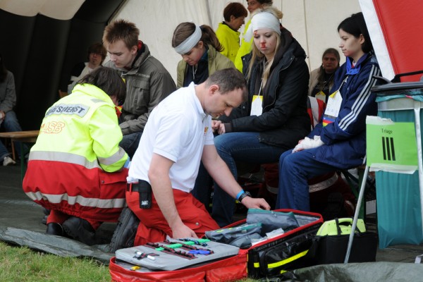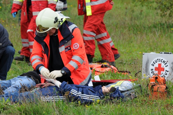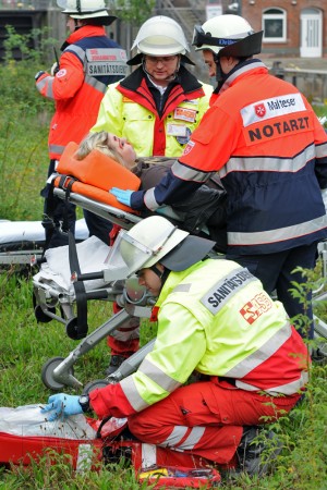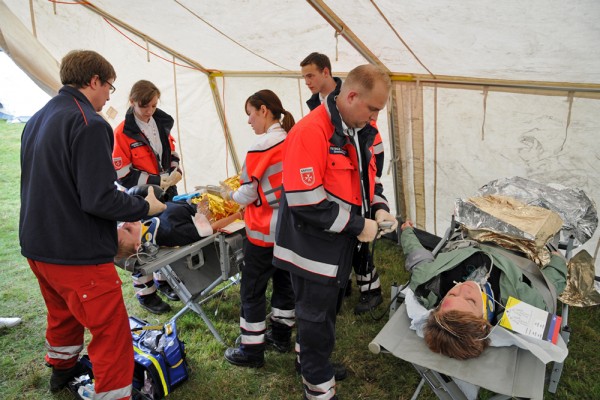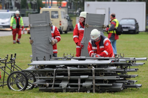 In der Zwischenzeit wurde auf einer freien Fläche eines angrenzenden Betriebsgeländes eine Verletztensammelstelle mit mehreren Zelten aufgebaut. Mit den neuen Notfallkrankentransportwagen konnten die Patienten im Pendelverkehr von der Einsatzstelle zur weiteren Behandlung zur Sammelstelle gebracht und von dort der Abtransport ins Krankenhaus koordiniert werden.