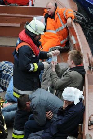 Nach dem die Leichtverletzten das erste Schiff verlassen hatten, konnten nun weitere Einsatzkräfte der Hilfsorganisationen dieses betreten und mit der Versorgung der zahlreichen Schwerverletzten oder Bewusstlosen beginnen. Gleichzeitig wurde die Sichtung auf den weiteren 2 Schiffen durchgeführt. Als Problem zeigte sich der große Höhenunterschied zwischen den einzelnen Schiffen und dem Land. Anfangs versuchte man die Verletzten mit mehreren Kleinbooten an eine Uferböschung zu bringen und dort an Land zu holen. Doch damit konnte man nach kurzer Zeit wieder aufhören. Ein Notfallkrankentransportwagen der ungünstig abgestellt wurde versperrte dem Technischen Hilfswerk die Zufahrt aufs Gelände – der Fahrer musste erst einmal ausfindig gemacht werden. Als das Technische Hilfswerk dann vor Ort war, konnte die Rettung schnell durchgeführt werden. Es wurden zwei Plattformen in Stellung gebracht, an denen je eine Schleifkorbtrage zum Retten der Personen hinab gelassen werden konnte.
