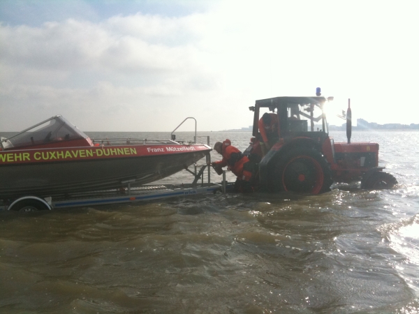 Der Einsatztraktor der FF Cuxhaven-Duhnen wurde alarmiert und nahm Kurs auf Rettungsbake 5 um das Strandrettungsboot ins Wasser zu bringen.