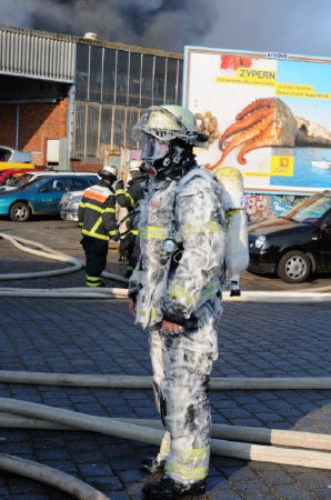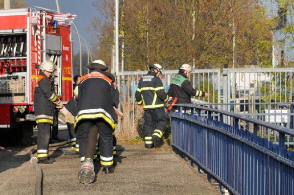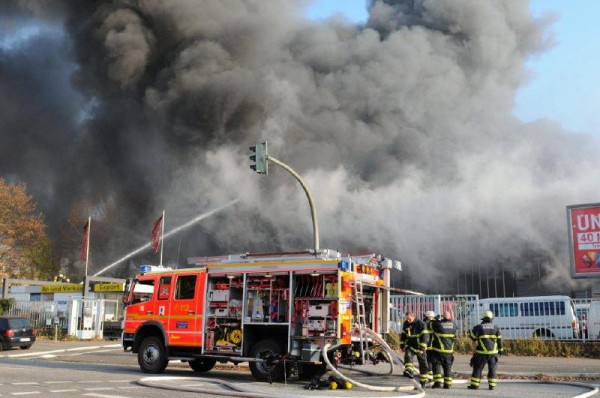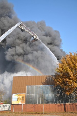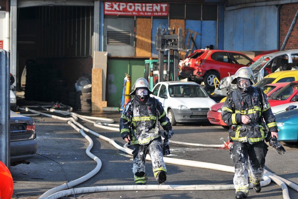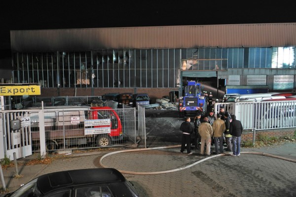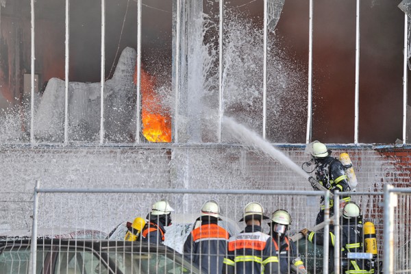 „In der Halle 60 x 40 Meter befinden sich Pkws mit Ersatzteilen, eine Lackierwerkstatt und weitere Gegenstände wie Teppiche“ so der Einsatzleiter vor Ort. Mit einer Drehleiter und einem Teleskopmastfahrzeug wurde die Brandbekämpfung von oben eingeleitet. Durch einen Kanal der direkt am Gebäude angrenzt konnte die Brandbekämpfung vom Boden aus nur von der Vorder- und Rückseite erfolgen. Durch die starke Hitzeentwicklung mussten anfangs Innenangriffe immer wieder abgebrochen werden. Teile der Halle stürzten auf der Wasserseite ein.