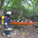 Nachdem die verschüttete Person im Laufe der Übung gefunden wurde, konnten die beiden PA- Trupps die Person mit Hilfe einer Schleifkorbtrage aus dem Bunker herausbringen. Dabei wurden die Trupps durch die im Bunker befindlichen Hindernisse besonders gefordert. Um anschließend einen möglichst schonenden Abtransport der Person innerhalb des unwegsamen Geländes zu gewährleisten, wurde die Person in der Schleifkorbtrage liegend mittels der Seilbahn gerettet.