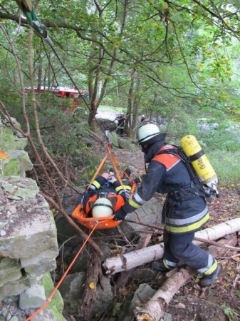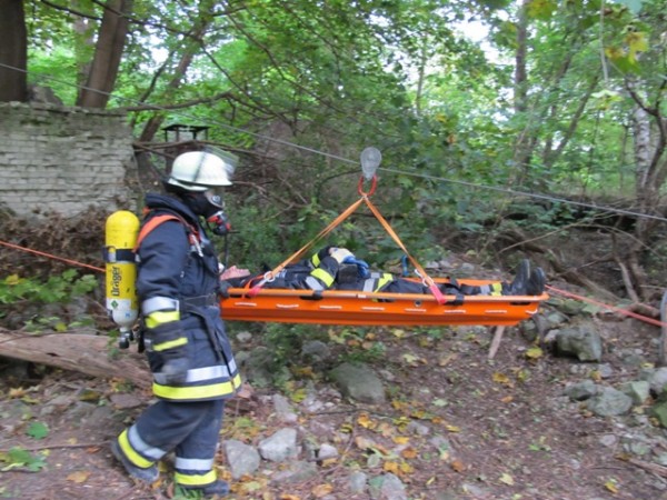 Nachdem die verschüttete Person im Laufe der Übung gefunden wurde, konnten die beiden PA- Trupps die Person mit Hilfe einer Schleifkorbtrage aus dem Bunker herausbringen. Dabei wurden die Trupps durch die im Bunker befindlichen Hindernisse besonders gefordert. Um anschließend einen möglichst schonenden Abtransport der Person innerhalb des unwegsamen Geländes zu gewährleisten, wurde die Person in der Schleifkorbtrage liegend mittels der Seilbahn gerettet.