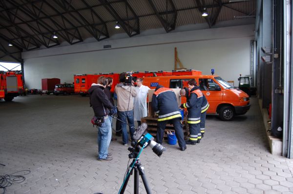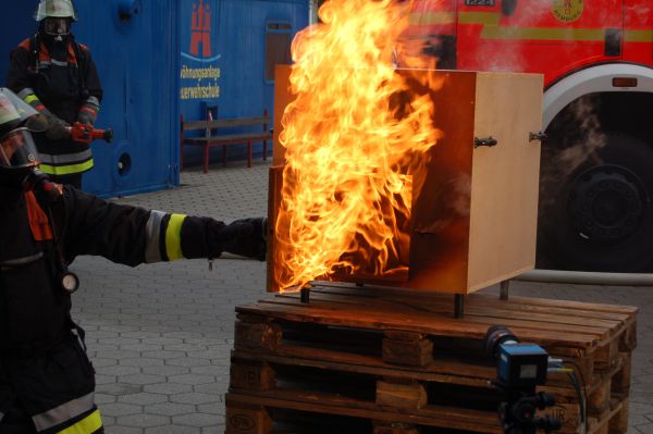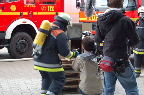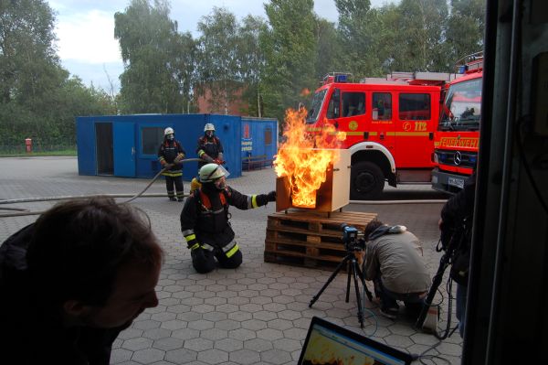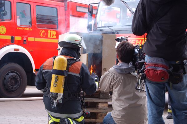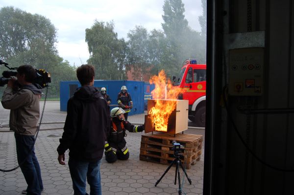 Für die Aufnahmen wurde u.a. eine High-Speed-Kamera in Stellung gebracht – mit Aufnahmen von 20.000 Bilder/Min. wurden die von uns herbeigeführten Rauchgasdurchzündungen eingefangen. Das das herbeiführen und beobachten von Rauchgasdurchzündungen eine spektakuläre Sache ist, war uns ja bereits im Vorfeld bekannt. Das die Aufnahmen in Zeitlupe mittels High-Speed-Kamera dermaßen beeindruckend wirken, hat uns sehr überrascht. Sehr überrascht von der Intensität eines solchen "kleinen" Flashovers zeigte sich das Filmteam – mit einer solch starken Wärmeentwicklung und Rauch- wie auch Brandausbreitung im Moment der Durchzündung hatten sie im Vorfeld nicht gerechnet. Somit wurde den Filmleuten auch sehr schnell klar, dass wir die Bedienung der "Flashover-Box" unter umluftunabhängigem Atemschutz und die Absicherung mittels eines C-Rohrs nicht aus medienwirksamen Gründen durchführten.