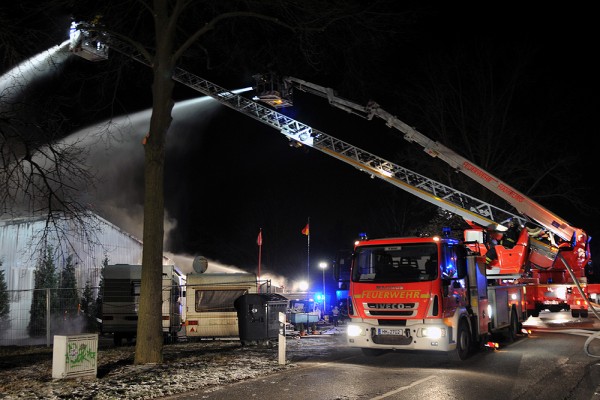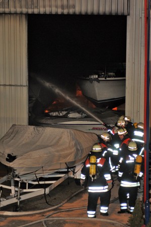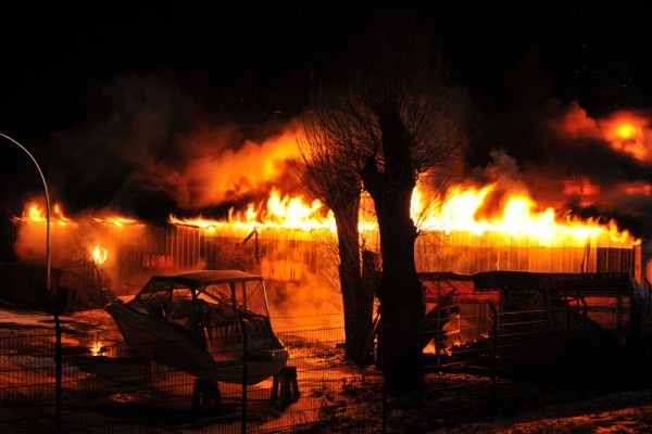 Es war bereits Feuerschein aus dem Dach der 50 x 30 Meter großen Lagerhalle sichtbar, in der etwa 50 Boote, Yachten und Kfz-Oldtimer den Winter über verbringen sollten. Innerhalb kurzer Zeit wurde auf „Feuer 3“ erhöht und zahlreiche Einsatzkräfte nachalarmiert. Eine FF wurde zur Kontrolle des Funkenflugs in der Umgebung eingesetzt. Eine verletzte Zivilperson wurde mit dem RTW ins Krankenhaus befördert.