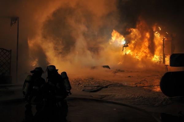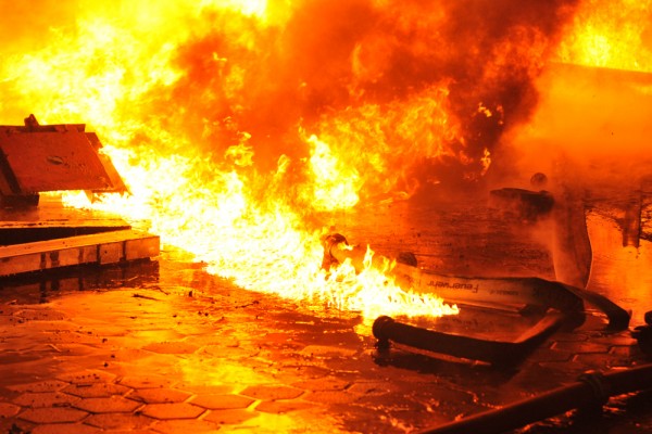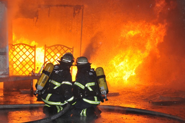 Das Feuer zündete in der Halle durch und brachte die Metallverkleidung zum glühen. Über eine Drehleiter, ein Teleskopmastfahrzeug, mit mehreren Wasserwerfern der HLF und Strahlrohren wurde die Brandbekämpfung eingeleitet. Mit einem Schaumrohr und weiteren C-Strahlrohren versuchte die Feuerwehr das Feuer im hinteren Bereich der Halle unter Kontrolle zu bekommen, doch durch auslaufenden Kraftstoff mussten sich die Einsatzkräfte von dort zurück ziehen und einiges an Material zurück lassen.