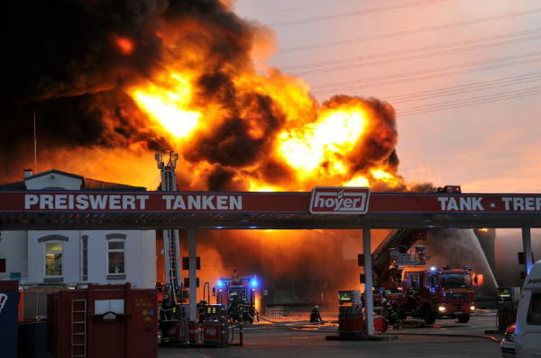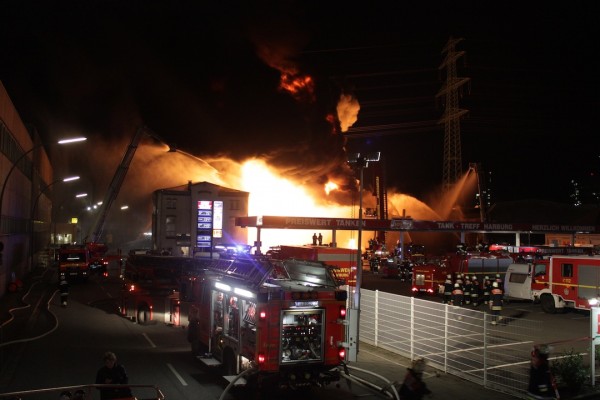Auch umliegende Werkfeuerwehren mit weiteren Teleskopmasten und Groß-Wasserwerfern (WF Holborn Europa Raffinerie) haben Kräfte aufgeboten und sind z.T. dorthin unterwegs.