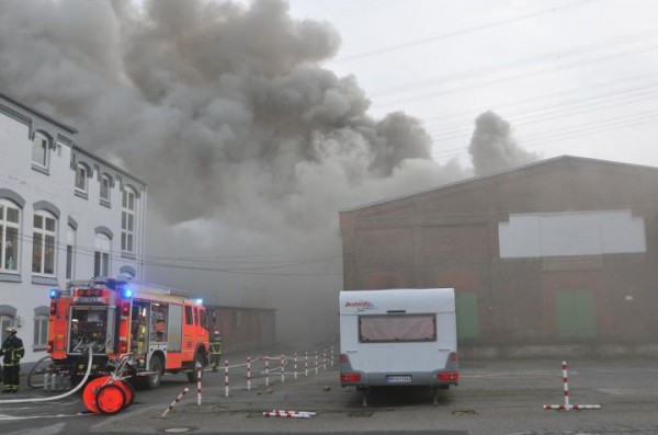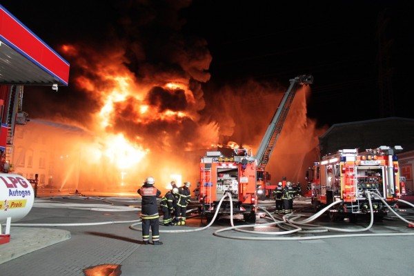 Die Halle einer alteingessenenen Quartiersleutefirma hat die Ausmaße von ca. 100x30m und ist überwiegend alte Bausubstanz. Neben dem Lagergut befinden sich auch Heizöl und gasbetriebene Gabelstapler in der Halle. Zu einem frühen Zeitpunkt ist bereits das Dach durchgebrannt und zum Teil eingestürzt. Eine nahe liegende Tankstelle und alle umliegenden weiteren Gebäude und Hallen müssen vor der massiven Wärmestrahlung geschützt werden.