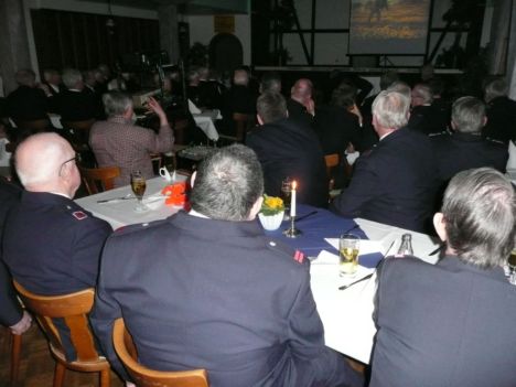 Nach einer Gedenkminute für die verstorbenen Kameraden blickte Bereichsführer Karsten Dabelstein auf das abgelaufene Jahr zurück. Neben dem stark angestiegenen Einsatzaufkommen blickte er zufrieden auf eine unverändert starke Personaldecke der Wehren im Bereich, die ausnahmslos eine Stärke von mindestens 30 Kamerad/innen aufweist. Neben der Bebilderung besonderer Einsatzlagen jeder Wehr in 2011 zog die Berichterstattung über die beiden Großfeuer in Hamburg zu Jahresbeginn das besondere Interesse der Zuhörer auf sich. „Das ist etwas was mich besonders interessiert“, sagte der ehemalige Wehrführer der FF Neuengamme Adolf Steffens. „Auch gerade deswegen komme ich immer wieder gerne hierher.“