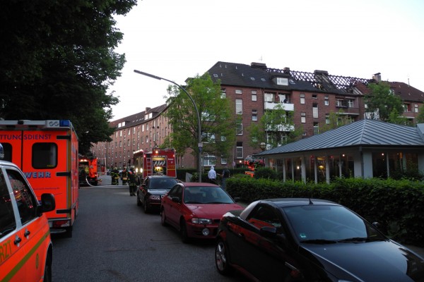 Gegen 1:56 Uhr meldeten Anwohner ein Feuer im Dachgeschoss eines großen Mehrfamilienhauses. Als nur wenige Minuten später die Berufsfeuerwehr Billstedt mit der FF Billstedt-Horn eintrafen schlugen die Flammen bereits aus dem Dach. Umgehend wurde auf „Feuer 2 – Menschenleben in Gefahr“ erhöht und zahlreiche weitere Kräfte rückten an.